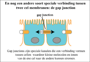 Gap junctions (ook wel ‘nexus’) zijn zeer gespecialiseerde structuren die de kloof tussen cellen overbruggen. Ze bestaan uit een aantal kanalen (‘connexons’ genoemd) waardoor ionen en kleine moleculen van de ene cel naar de andere kunnen stromen. Zie: A.3.6. De elektrische synaps.