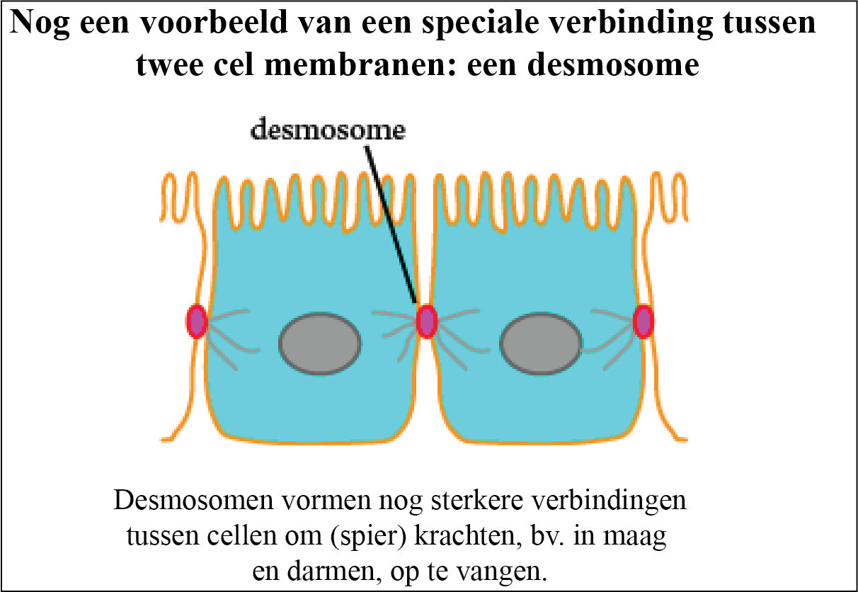 Desmosomen vormen nog sterkere verbindingen tussen aangrenzende cellen, wanneer sterkere krachten betrokken moeten worden (bijvoorbeeld in de maag en het darmstelsel).