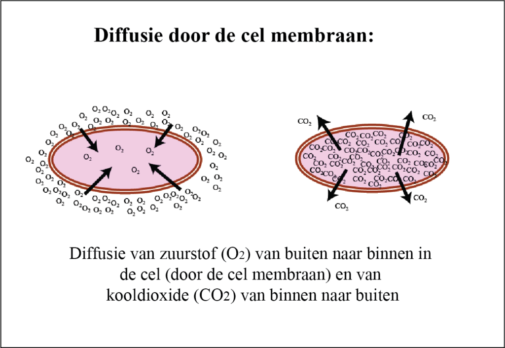 Dus, als er een concentratieverschil is voor zuurstof, dan zal zuurstof door het membraan diffunderen en zichzelf automatisch in de cel transporteren. Dit vereist geen energie.