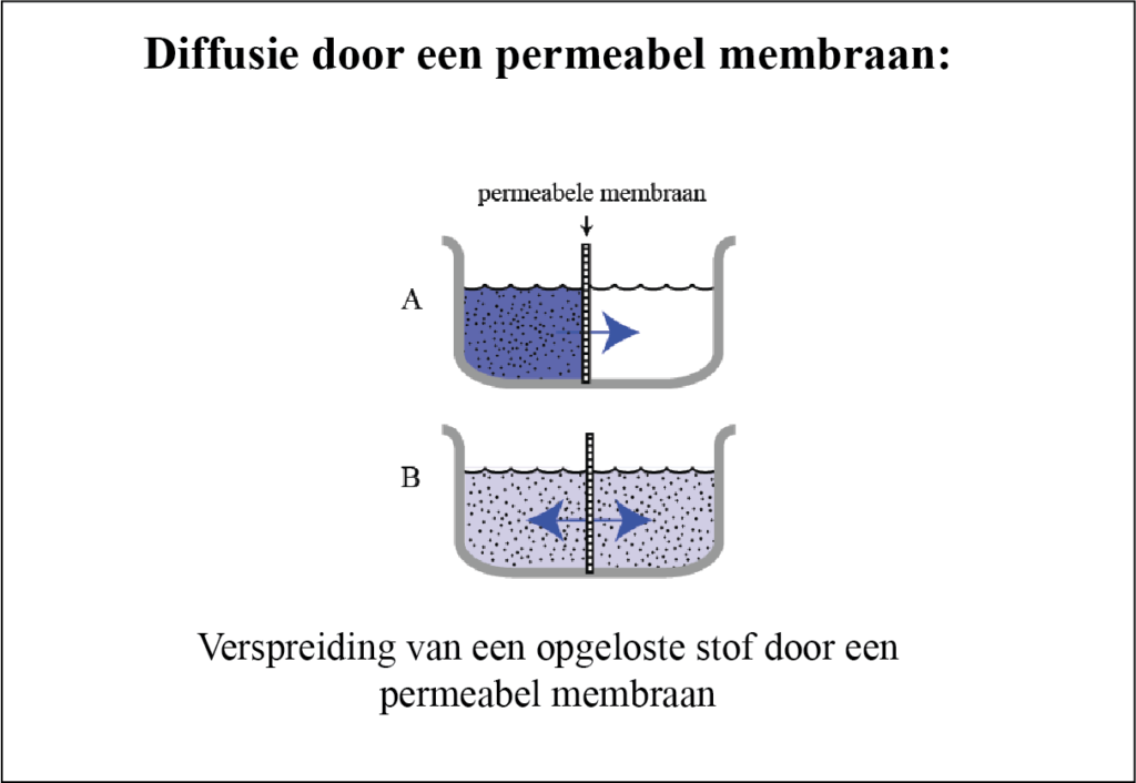In het lichaam vindt diffusie altijd plaats door de celmembranen. Dit gebeurt als de concentratie van iets (= de opgeloste stof) aan de ene kant van het membraan hoger is dan aan de andere kant, en als het membraan daarvoor doorlaatbaar is (= permeabel).