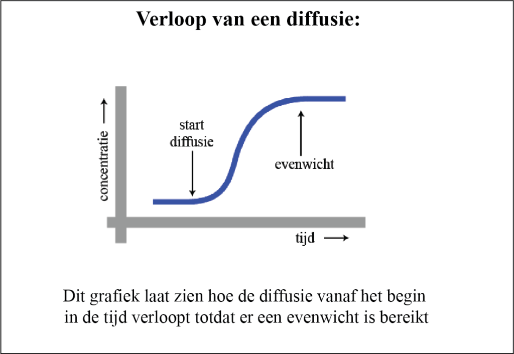 De grafiek toont wat er gebeurt wanneer de diffusie wordt gestart. Na enige tijd is de concentratie aan beide zijden gelijk geworden en zal de netto diffusie worden gestopt (waarom ‘netto’?)