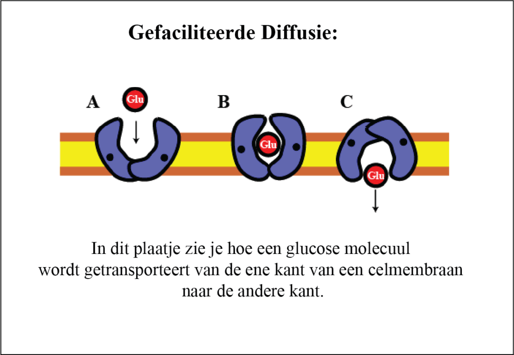 Een beroemd voorbeeld van gefaciliteerde diffusie is het transport van glucose (= suiker) naar de cel.