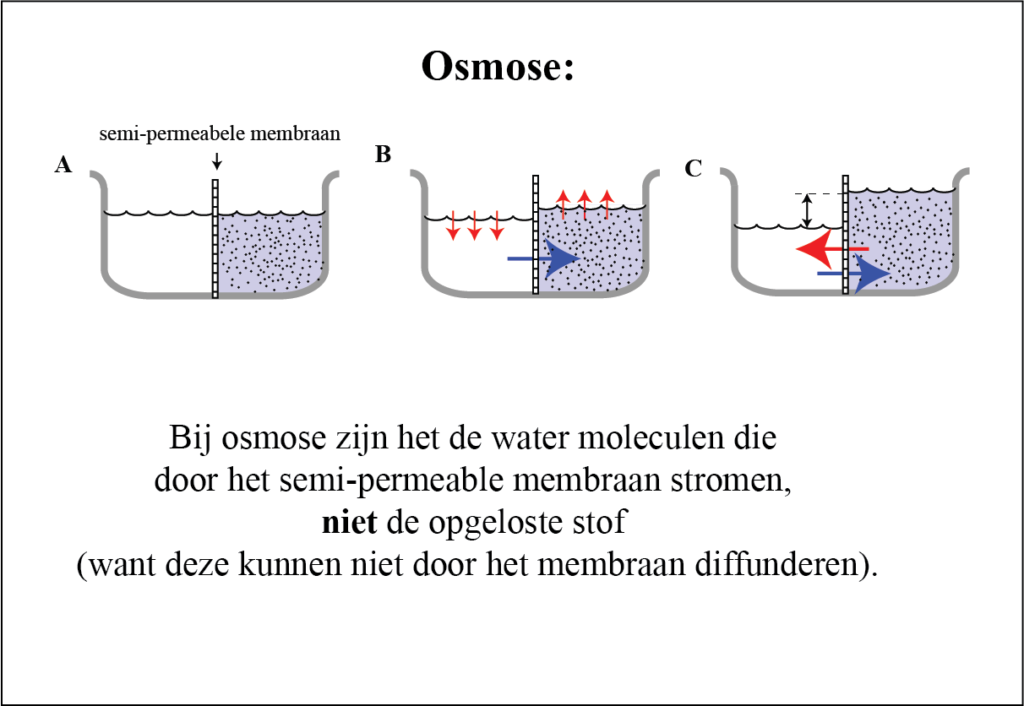 In het diagram (A) is er meer opgeloste stof (blauw) rechts dan links van het membraan. Maar deze opgeloste stof kan het membraan niet passeren, terwijl water dat wel kan.