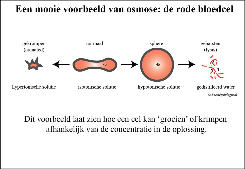 Het tegenovergestelde kan ook gebeuren. Als de rode bloedcel zich in een oplossing bevindt die te veel zout bevat (= hypertoon), dan zal water uit de cel bewegen; de rode bloedcel zal dan krimpen!