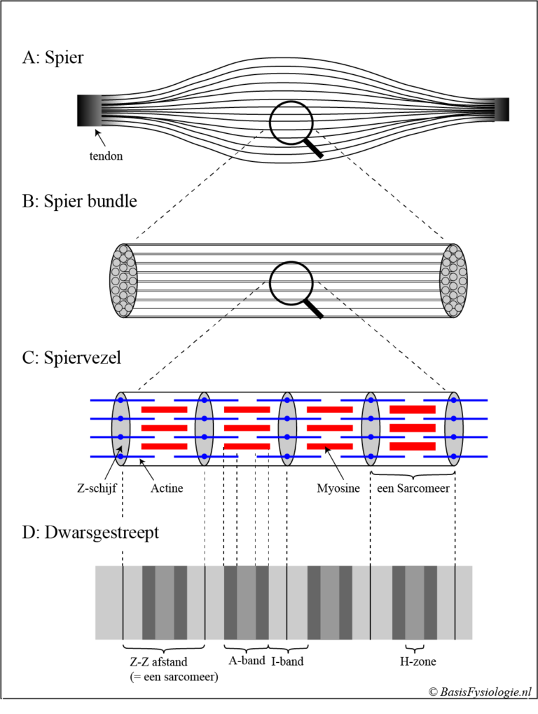 De donkere A-band komt overeen met de lengte van de myosine moleculen (dit zijn dikke moleculen en daarom wordt er minder licht doorgelaten; vandaar dat zij er donkerder uitzien onder de microscoop).