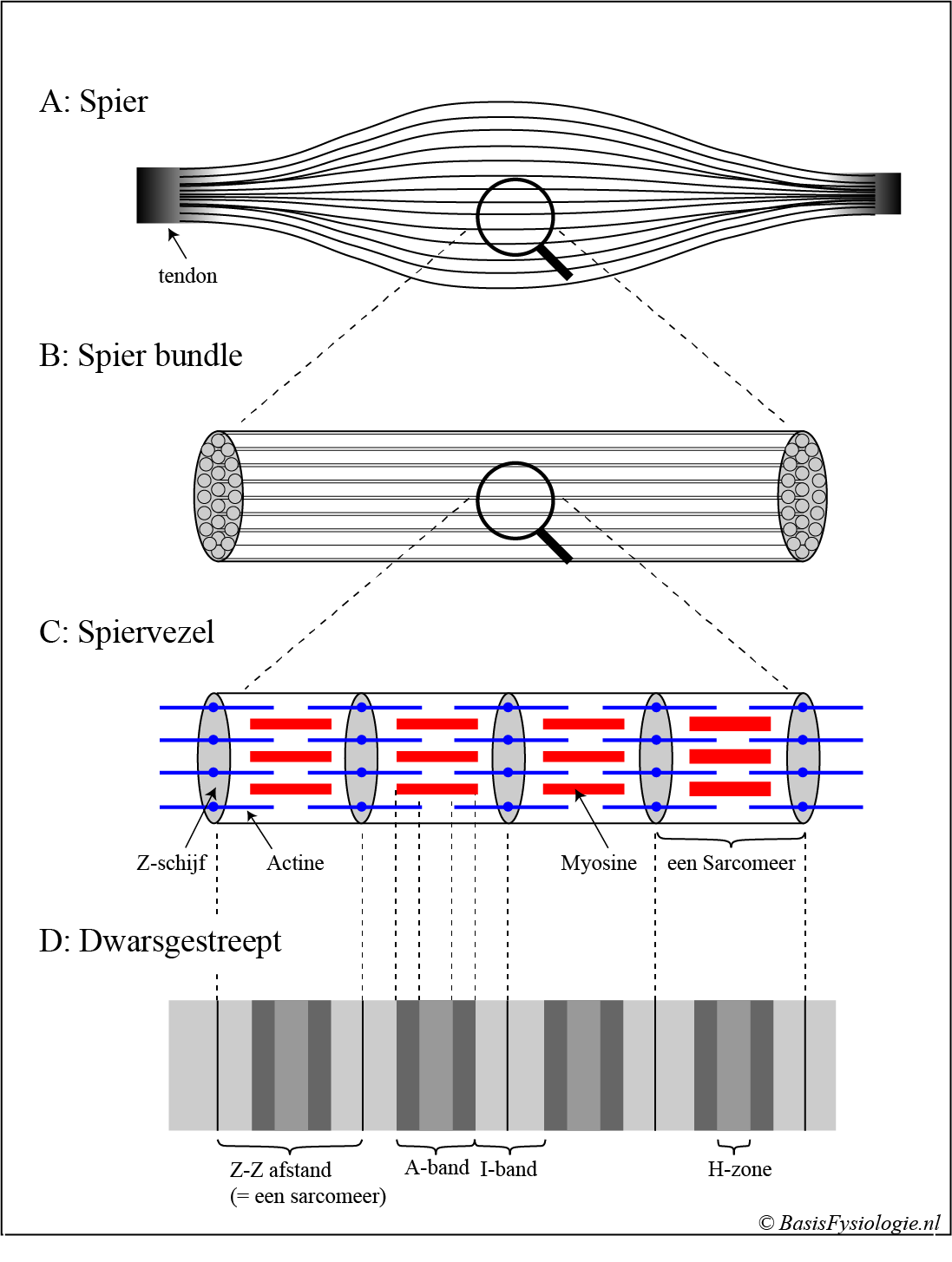 De donkere A-band komt overeen met de lengte van de myosine moleculen (dit zijn dikke moleculen en daarom wordt er minder licht doorgelaten; vandaar dat zij er donkerder uitzien onder de microscoop).
