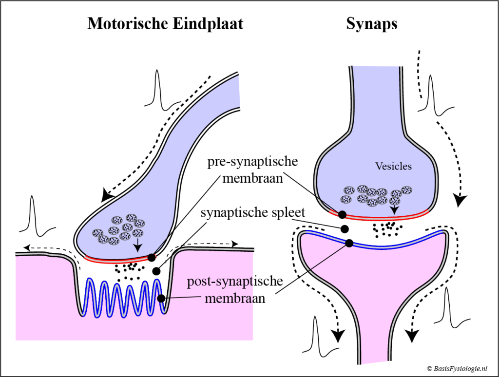 Cruciale verschillen tussen synaps en motor-eindplaat zijn: