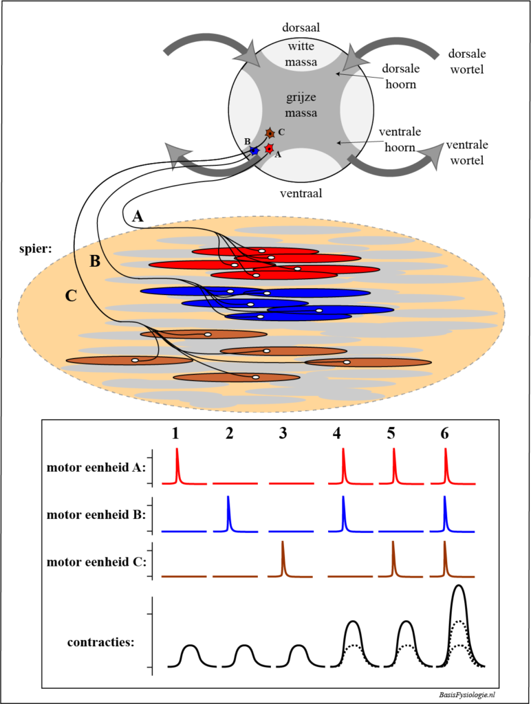 Een voorbeeld van een aantal motor-units wordt in de figuur getoond. In dit geval worden drie motorische eenheden getoond (drie motorneuronen A, B en C en hun respectievelijke spiervezels; rood, blauw en bruin), allemaal in dezelfde spier gelokaliseerd.