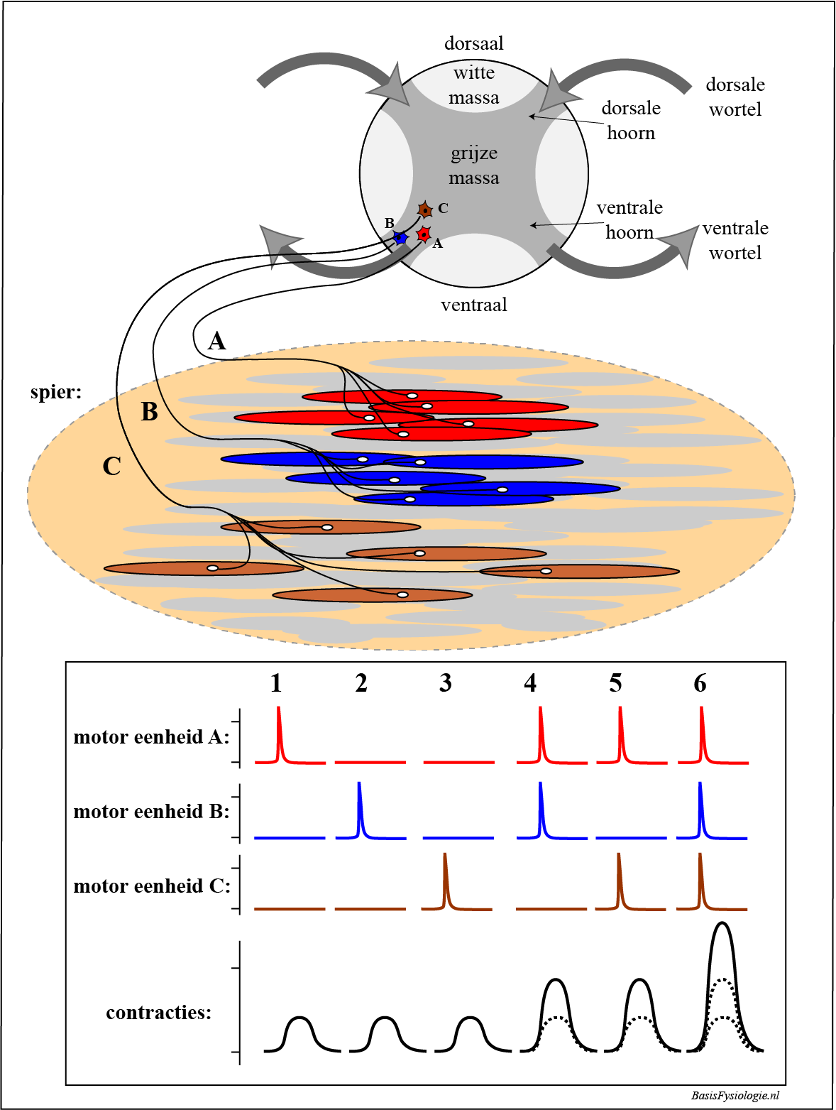 Als motorneuron A vuurt, dan zullen de rode spiervezels samentrekken. Als motorneuron B of C vuren, dan zullen de blauwe of de bruine vezels samentrekken. Dit wordt weergegeven in de grafiek in situaties 1, 2 en 3.