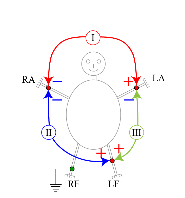- afleiding I: tussen rechterarm (RA) en linkerarm (LA)