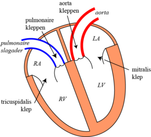 (RA = rechterboezem; LA = linkerboezem; RV = rechterkamer; LV = linkerkamer).