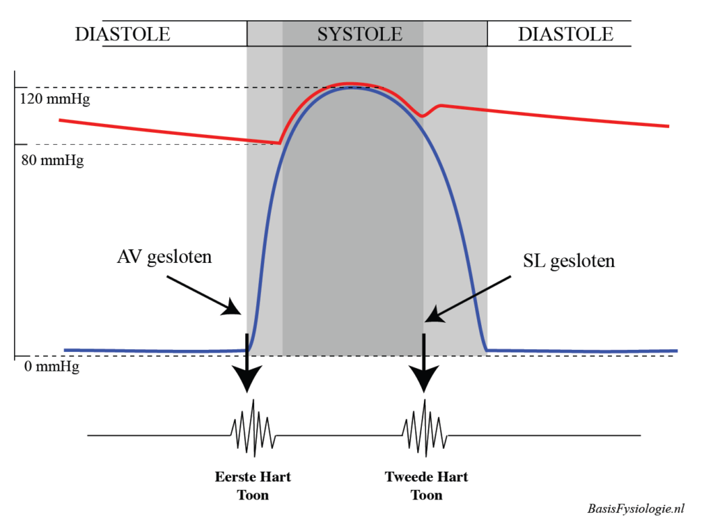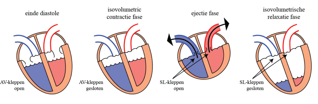 Aan het begin van de systole neemt de druk in de ventrikels toe en hierdoor sluiten de AV-kleppen direct. Onthoud dat de SL-kleppen nog steeds gesloten zijn (de druk in de slagaders is nog steeds hoger dan in de ventrikels).