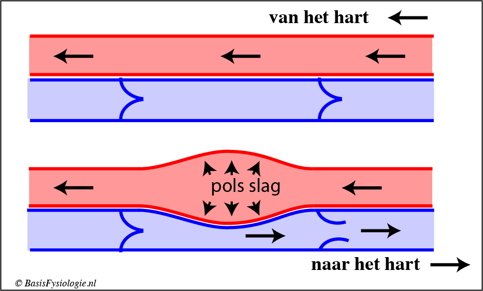 In het lichaam lopen de arteriën en venen vaak parallel aan elkaar. Daarom, wanneer een polsslag zich door een arterië verspreidt, zal dit een lokale uitzetting (uitpuiling) veroorzaken en deze zwelling zal tegen de venen duwen. Dit verhoogt de lokale druk in de venen. Deze drukverhoging zal het veneuze bloed naar het hart duwen.