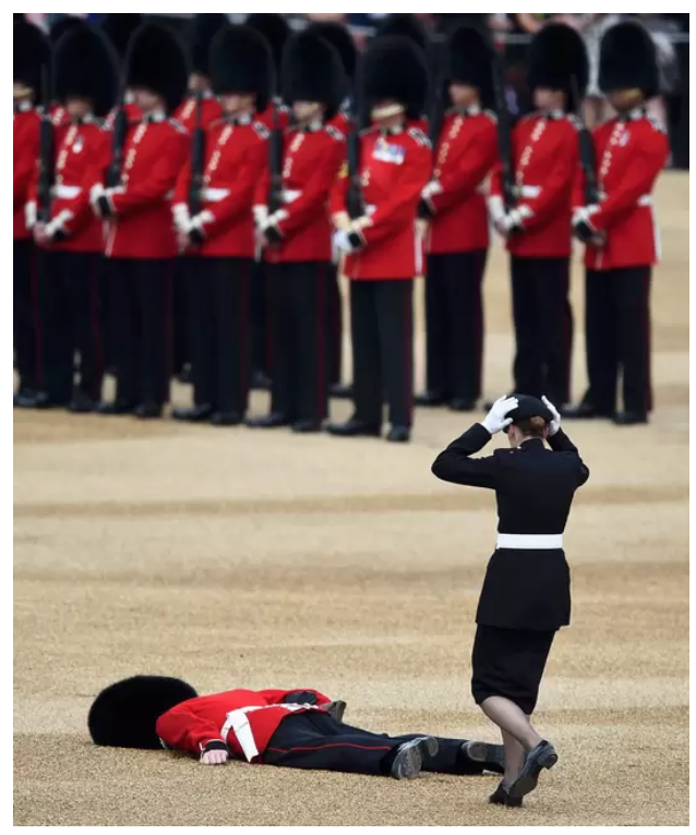 De reden waarom deze persoon flauwviel, is omdat hij absoluut roerloos moet staan, hij mag geen enkele spier bewegen, zijn veneuze terugstroom werd te laag, wat op zijn beurt zijn hartminuutvolume verminderde, waardoor er niet genoeg bloed naar zijn hersenen stroomde, en dus valt hij flauw!