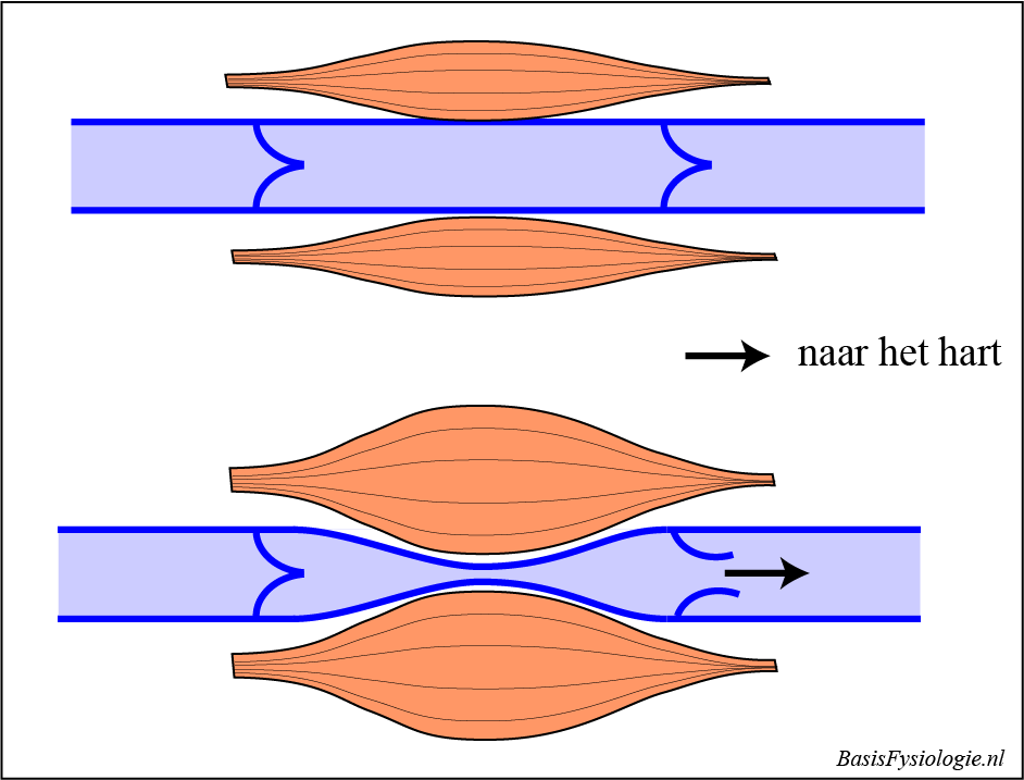 Aangezien skeletspieren meestal ritmisch samentrekken (zoals bij wandelen, hardlopen, fietsen), zal dit een ritmische bloeddruk in de venen veroorzaken en daardoor een ritmische stroom van veneus bloed naar het hart.