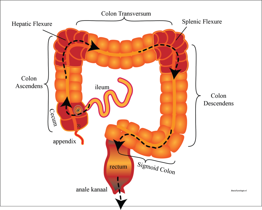 Dit is waar de voedselresten (=chymus) dat uit de dunne darm komt, geleidelijk wordt omgezet in ontlasting.