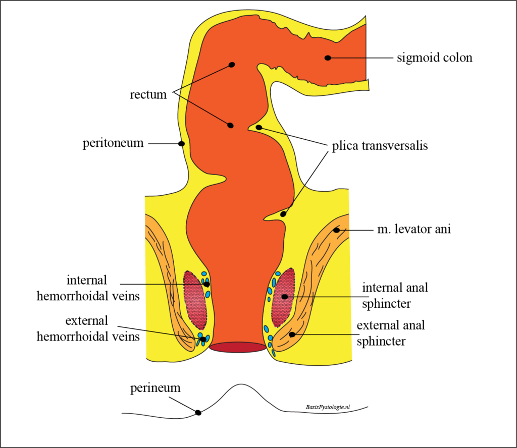 Let ook op in het diagram de locatie van twee veneuze plexussen; de interne en externe hemorrhoidale aderen.